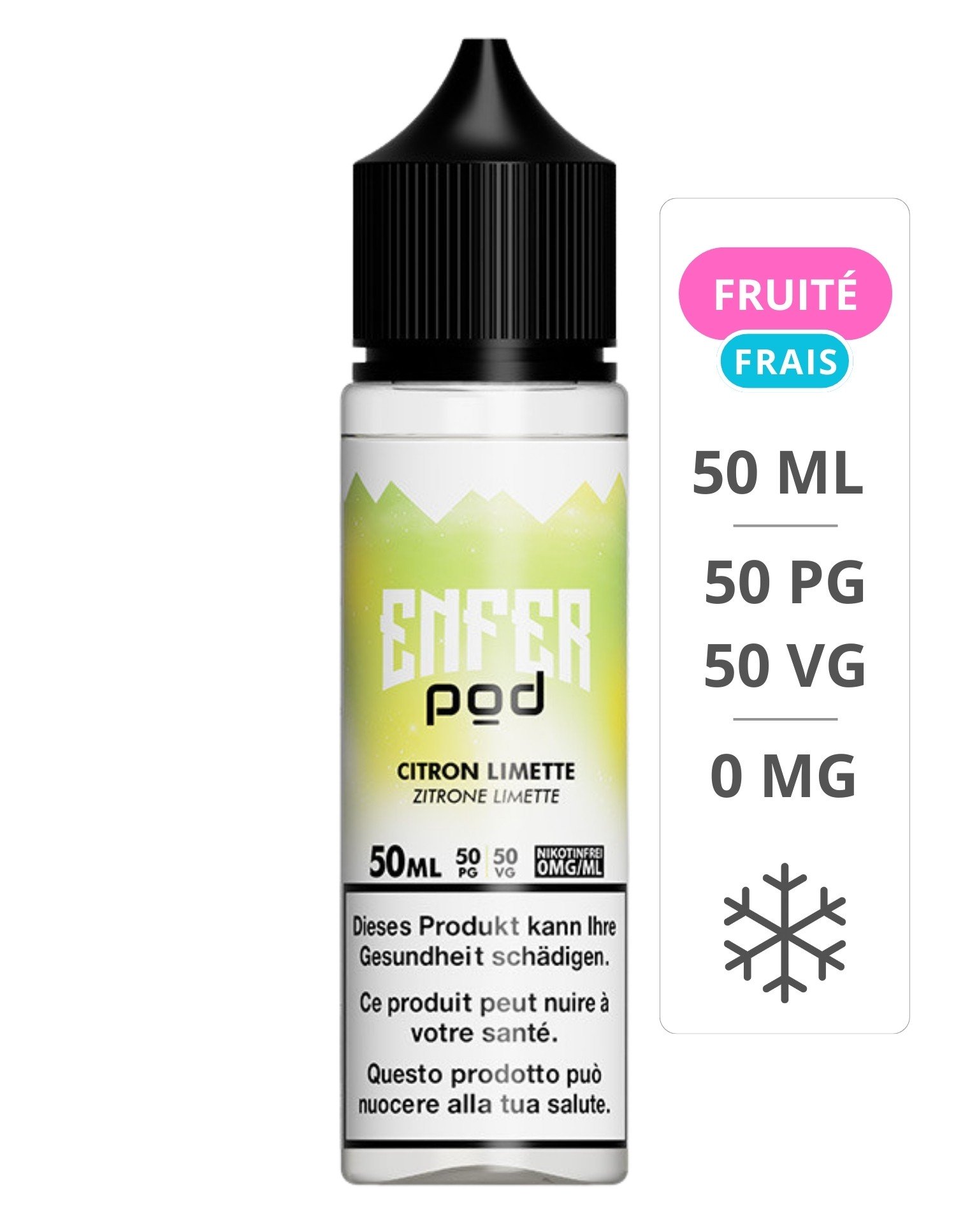 E-Liquide Citron Limette 50 ml – Enfer Pod associe citron jaune vif et limette acidulée pour une vape fraîche, fruitée et pleine de peps.