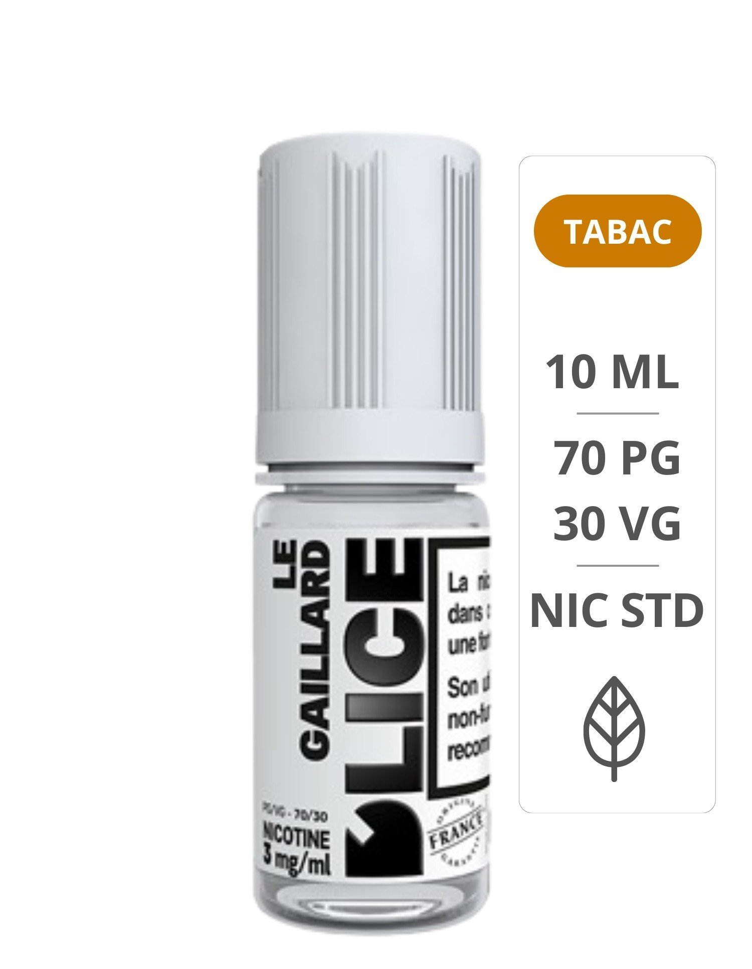 Vendu en flacon de 10 ml, Le Tabac le Gaillard est fabriqué par D’LICE en France et produit dans une base 70/30 PG/VG.