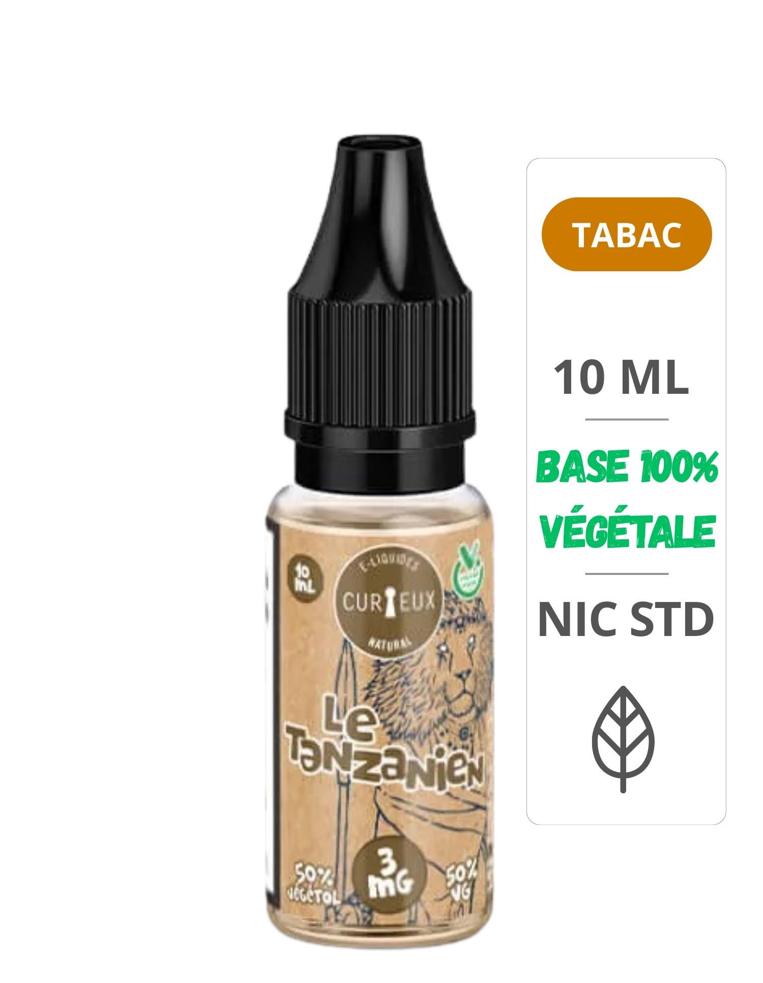 Fabriqué par les laboratoires Curieux. Vendu en flacon de 10 ml, Le Tanzanien est créé par Curieux en France et produit dans une base 100% végétal 50/50 végétol/VG.