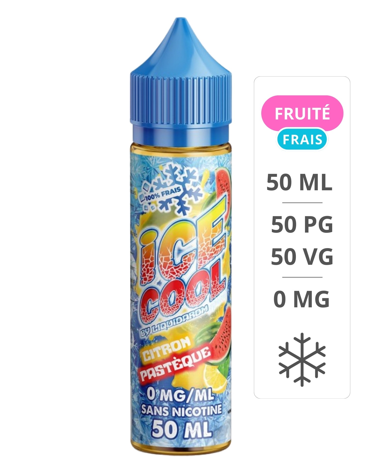 Vendu en flacon de 50ml le e-liquide citron pastèque de la gamme Ice cool est composé de 50% de glycérine végétale et de 50% de propylène glycol.