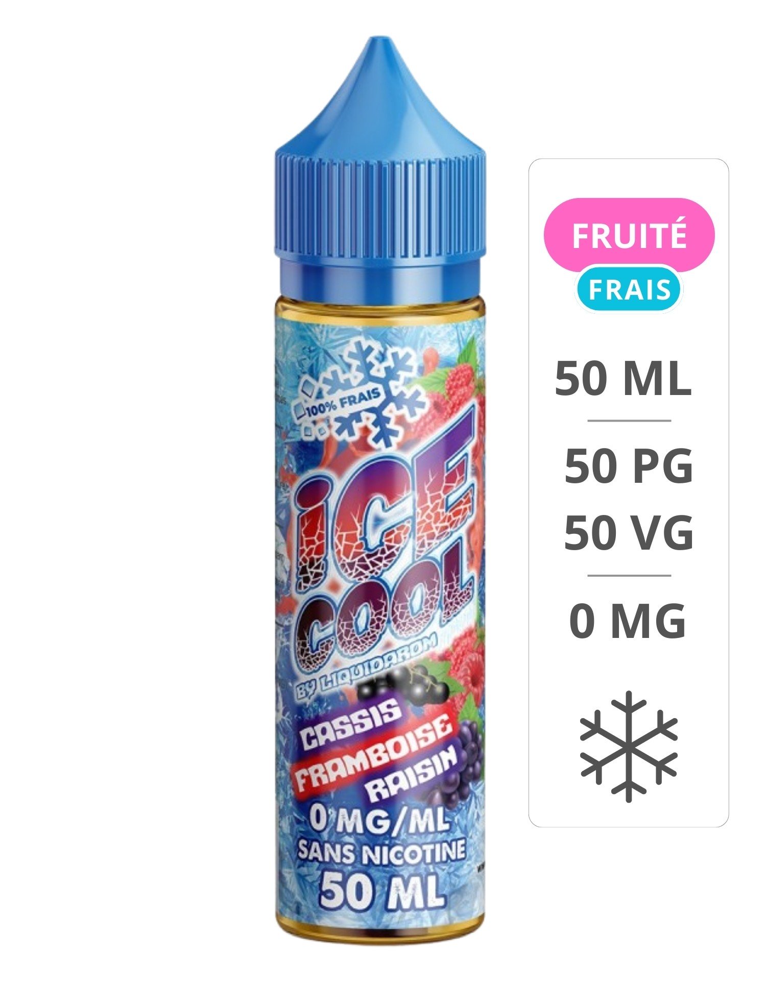 Vendu en flacon de 50ml le e-liquide Cassis Framboise et Raisin de la gamme Ice Cool est composé de 50% de glycérine végétale et de 50% de propylène glycol.