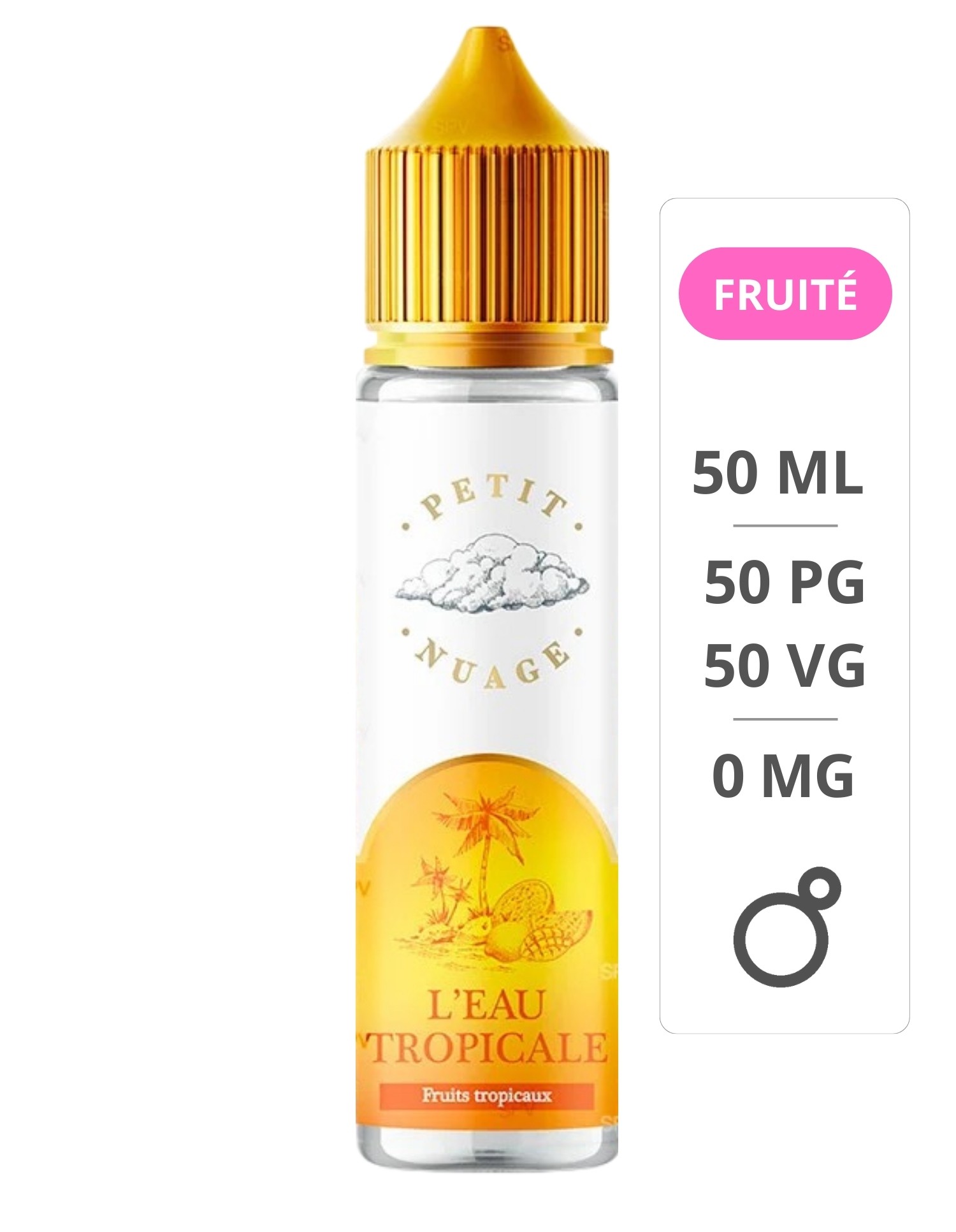 L'Eau Tropicale est vendu en flacon de 60 ml, le e-liquide The sun est créé par les laboratoires Petit Nuage en France et produit dans une base 50/50 PG/VG.