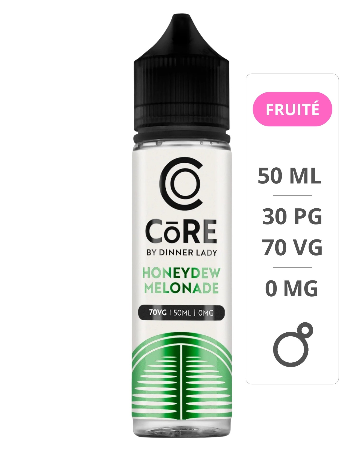 Le e-liquide Honeydew Melonade de la gamme Core by Dinner Lady associe l’onctuosité d’un melon miel juteux à la vivacité d’une limonade maison légèrement acidulée, le tout sur une base 70 % VG / 30 % PG pour une vapeur dense et savoureuse.